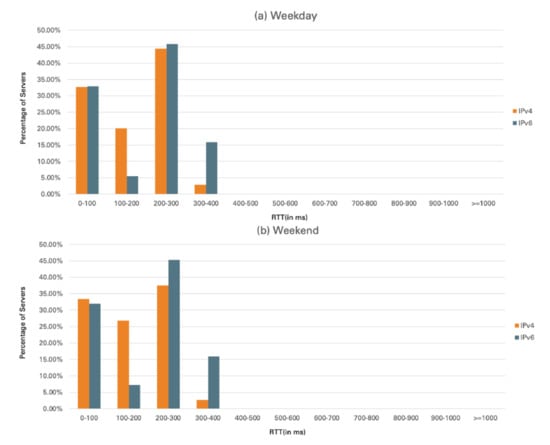 Table 6 shows the average RTT of IPv4 and IPv6 on weekdays and weekends. The RTT result shows that IPv6 is slightly higher than IPv4. The average RTT of IPv6 on weekdays is 194.97 ms, while IPv4 is 167.35 ms; on the weekends, IPv6 is 194.72 ms, while IPv4 is 160.08 ms. Table 6 also shows that there is only a slight difference in RTT between weekdays and weekends. For IPv4, there is about a 7 ms difference; for IPv6, the difference is about 0.25 ms. The distributions of IPv4 and IPv6 RTT are shown in Figure 7. It can be observed that there is not much difference between weekdays and weekends. It can also be seen that in the range of 300 to 400 ms (longest delay), the sites are mainly IPv6 sites.