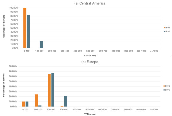 From another perspective, two studies [10,11] conducted similar IPv6 and IPv4 performance analyses on dual-stack environments in 2007 and 2014. In [10], the dual-stack IPv6/IPv4 performance under various tunnel brokers was measured. The result showed that IPv6 had better connectivity and higher throughput but a lower hop count and higher latency. For the tunnel performance evaluation, FreeNet6 had the best performance result. Reference [11] sent probing traffic to dual-stack clients or servers in different regions to evaluate and compare the network performance of IPv6 and IPv4. The result revealed that the IPv6 packet loss rate and RTT were higher, and the number of hops and throughput was lower. Our study followed the methodology in [10,11] to evaluate the performance of today’s IPv4 and IPv6 networks and measure the end-to-end experience.
