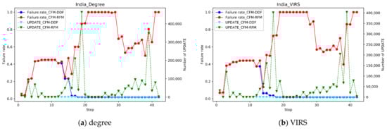 As shown in Figure 3, the recovery feedback mechanism is a facilitator to cascading failure. When the step is at 18–20 and 30–40, the CFM-RFM considering the RP produces a large number of UPDATE messages due to the recovery mechanism, which accelerates the cascading failure process and causes the improved network to collapse more quickly. It reflects that the increase in the number of UPDATE messages is positively correlated with the degree of network failure, which is also in line with the actual situation. In the CFM-DDF without RP, the network quickly returns to normal under the recovery mechanism. The number of UPDATE messages goes to 0.
