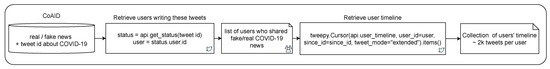 https://healthfeedback.org/ (accessed on 13 November 2020). The publishing dates of the collected information range from 1 December 2019 to 1 November 2020. We used tweets containing fake news or real news URLs, and from them, we extracted the social media users who authored them. The CoAID dataset lists the real tweet ID, but for privacy constraints, the user ID of each author is masked, so we need to query the Twitter API to retrieve them. We built an extended version of CoAID by retrieving each user’s entire timeline from 1 December 2019. Our extended version of the CoAID dataset is publicly available on Figshare