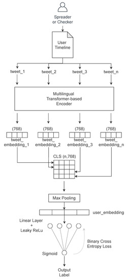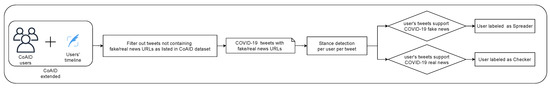 https://github.com/GateNLP/StanceClassifier (accessed on 13 November 2020). The stance classification output defines whehter the tweet supports, denies, queries, or comments on the linked news. We discard the query and comment cases while counting support and deny ones. If a user supports more fake news than real news, they are labeled as a spreader, and for vice versa, they are labeled as a checker. In the case of an equal number for real and fake news, the user is discarded. The pipeline describing this process is presented in