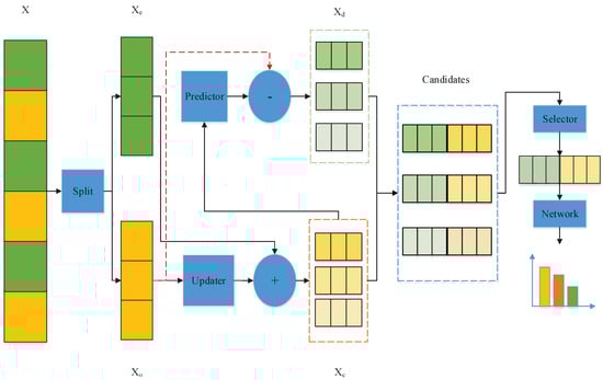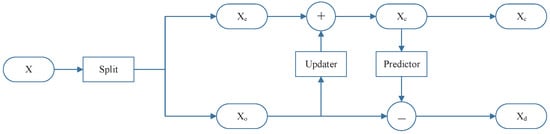 The overall flowchart of the lifting scheme is shown in Figure 1. A time series is split into the even component and odd component as presented in Equation (1):