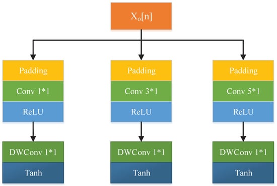 For the adaptive lifting scheme, is updated by a fixed order polynomial. A predefined neighborhood is not always an optimal solution due to the noise and data distribution. To better obtain the low frequency component , a multi-scale neighborhood is considered in the AMSW-NN. The structure of the updater is presented in Figure 3. Similar to [16], reflection padding is first applied to the instead of the zero padding. Then, an Inception-like module is proposed to update the in the multiple scales. It consists of the and convolution kernels followed by the Rectified Linear Unit (ReLU) activation and the depthwise convolution (DWConv) kernels followed by the hyperbolic tangent (Tanh) activation. could be obtained from the output of updater and as Equation (2).
