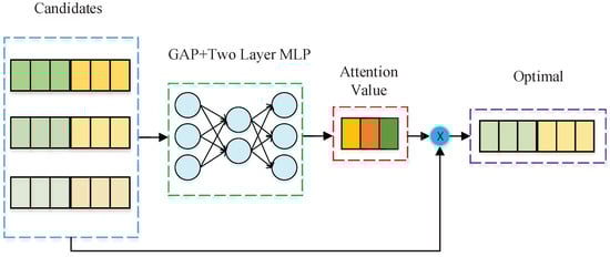 The frequency decomposition of the time series is determined after the update and prediction in the original lifting scheme. However, the Inception-like module used in the updater and predictor results in a multi-channel feature map as Figure 2. Each channel of the feature map could be considered as a candidate frequency decomposition of the time series. The function of the selector is to choose the optimal frequency decomposition from the candidates. The structure of the selector is presented in Figure 5. A squeeze-and-excitation module [21] is applied to put the channel attention on each channel and select the optimal channel from the candidates. Given the candidate frequency decompositions , a global average pooling (GAP) layer combined with a two-layer Multilayer Perceptron (MLP) as Equation (7) is used to learn the importance of each candidate frequency decomposition.