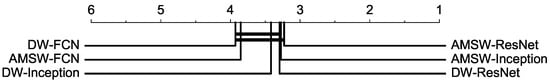 Critical difference diagram showing statisitical difference comparison of DW-FCN, DW-ResNet, DW-Inception, AMSW-FCN, AMSW-ResNet, and AMSW-Inception on the UCR archive.