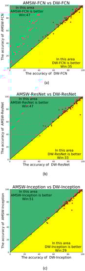 The results of the pairwise comparison. (a) shows the accuracy of AMSW-FCN against DW-FCN, (b) shows the accuracy of AMSW-ResNet against DW-ResNet, (c) shows the accuracy of AMSW-Inception against DW-Inception.