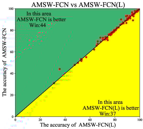 The loss function for training the AMSW-NN contains the detail loss and mean loss as presented in Equation (8). In Section 4.1, is set to 0 which means the high frequency is not suppressed. In this section, is set to as [16] to suppress the detailed coefficients. AMSW-FCN with this loss function called AMSW-FCN(L) is trained on the UCR archive again. The pairwise comparison between AMSW-FCN and AMSW-FCN(L) is shown in Figure 9.