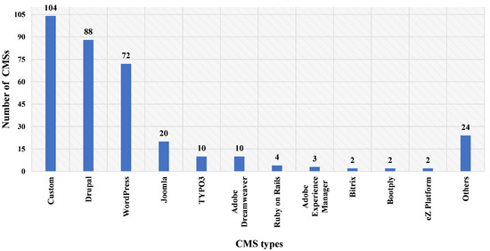 Furthermore, in Figure 2, we present the different CMS types that the 341 websites used. Within Figure 2, the horizontal axis articulates the name of the CMSs. We identified 35 different CMS types. The number in each bar indicates the number of websites that selected a specific CMS type. For example, 104 websites use a custom website development approach, 88 Drupal, 72 WordPress, etc. Lastly, for space-save reasons, in the last bar at the right, we include 24 websites out of 341 that use other CMS types.