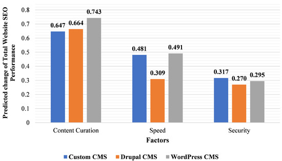 From an overall perspective, there are some important differences between custom, Drupal and WordPress CMSs regarding the three different factors and the predicted constants (see Figure 3). WordPress CMS has the highest predicted change regarding the Content Curation factor with a value of 0.743, followed by Drupal (0.664) and custom CMSs (0.647). This practically means that WordPress administrators are in a more favorable position regarding their efforts on Content Curation variables to improve the Total Website SEO Performance rather than Drupal or custom CMSs. WordPress CMSs (0.491) barely outperformed custom approaches (0.481) in terms of the Speed factor. At the same time, Drupal received the lowest predicted value of change at 0.309. Lastly, in terms of the Security factor, custom CMSs approaches received the highest predicted value of change, reaching up to 0.317, followed by WordPress (0.295) and Drupal (0.27).