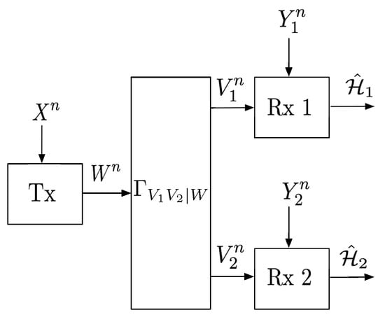 for two given pmfs and . The transmitter can communicate with the receivers over n uses of a discrete memoryless broadcast channel where denotes the finite channel input alphabet and and the finite channel output alphabets. Specifically, the transmitter feeds inputs