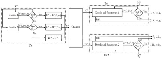 The transmitter attempts to quantize the source sequence using a random codebook consisting of codewords . If the quantization fails because no codeword is jointly typical with the source sequence, then the transmitter applies the UEP mechanism in [17] by sending an IID -sequence over the channel. Otherwise, it sends the codeword for m indicating the first index of the codeword that is jointly typical with its source observation . The receiver jointly decodes the channel and source codeword by verifying the existence of indices such that is jointly typical with its channel outputs and there is no other codeword with smaller conditional empirical entropy given than . If the decoded codeword is jointly typical with the receiver’s observation , then it produces , and otherwise .