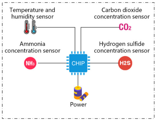 In addition, the harmful gases in the dairy barn mainly include , , , etc. [16]. Therefore, the terminal acquisition node introduced in this section includes a multi-sensor module (temperature and humidity, , , and sensors), a data processing unit, and a power supply module. The node is powered by a lithium battery. The overall architecture of the acquisition node is shown in Figure 2.