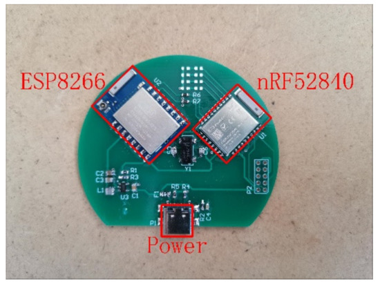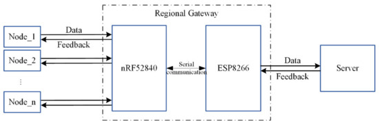 The gateway of the information transmission system is responsible for building a two-way communication link between the acquisition node and the server side, and realizes the transmission and feedback of multi-parameter environmental information from the terminal collection node to the server side. The Bluetooth module uses the nRF52840 radio frequency chip [23] produced by Nordic that supports the BLE5.0 protocol, and the Wi-Fi module uses the ESP8266EX chip produced by Espressif. The functional design of the gateway is shown in Figure 3.