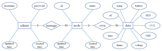 The ER diagram of the database is shown in Figure 5. The database is composed of an administrator table, a node table, a single node history data table, and all the nodes’ latest data tables.