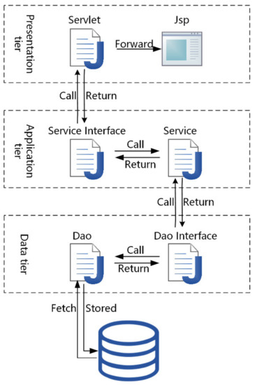 In order to implement the idea of “high cohesion, low coupling”, we divide the server business applications into the following three levels: presentation layer (UI), business logic layer (BLL) and data access layer (DAL) [27], where the presentation layer is responsible for data visualization, the business logic layer combines the basic operations of the data access layer for specific businesses to form complex business operations; and the data access layer defines the DML (Data Manipulation Language) and DQL (Data Query Language) operations of the database [28], and directly manipulates the database data. The three-tier architecture of the server is shown in Figure 6.