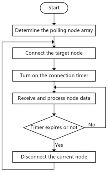 As the core of the system, the server is responsible for data processing and request response. Aiming at the problem of frequent disconnection under Bluetooth-one-master-multi-slave star connection, a time-sharing connection mechanism is designed to enhance connection stability. In order to further save node energy consumption, a sampling period adaptive adjustment mechanism is introduced. The server workflow is shown in Figure 7.