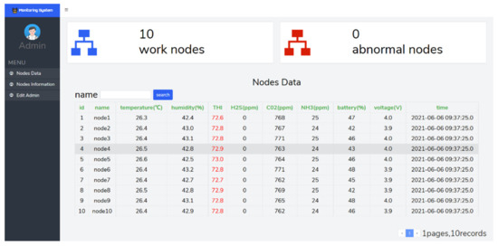 This experiment is divided into two parts, deploying a gateway, and running ten collection nodes for 14 days in a laboratory environment and two days in a dairy farm environment. The screenshots of each interface of the data visualization system are shown below. The node’s latest data interface displays the latest data of the working node. A screenshot of the interface is shown in Figure 8.