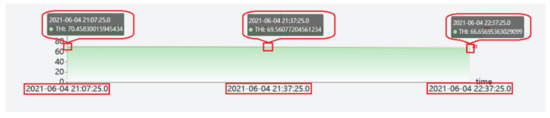 In order to enhance the human–computer interaction capabilities, the visualization system is designed to mark red warnings for abnormal parameters. When the environmental THI exceeds 70, milk production will decrease [31]. According to the standards designated by China for the environmental quality of the cowshed area, must not exceed 20 mg/m3, must not exceed 8 mg/m3, and must not exceed 1500 mg/m3. Therefore, the abnormal parameter is defined as THI, which is higher than 70, the concentration is higher than 28.8 ppm (20 mg/m3), the gas concentration is higher than 5.76 ppm (8 mg/m3), the gas concentration is higher than 840 ppm (1500 mg/m3), the electricity is lower than 20% and the voltage is lower than 3 V.