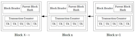 Blockchains are a data structure of chained blocks containing transactional data and connected by including the previous block’s hash in each block’s header, as illustrated in Figure 2. Typical applications of blockchains are cryptocurrencies and smart contract platforms, such as Bitcoin [33] and Ethereum [34]. In these examples, blocks store cryptographically signed transactions with the whole blockchain, providing a public, decentralized, tamper-resistant ledger with ensured consistency and a global consensus among the network’s peer-to-peer (P2P) nodes.