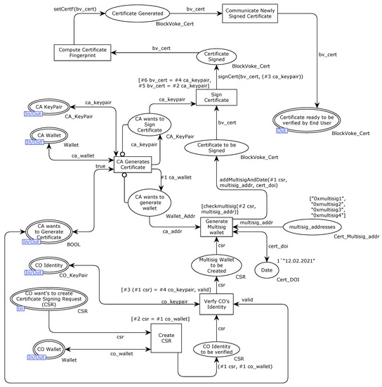 Figure 8 shows the ‘Generate Certificate‘ sub-module of BlockVoke’s top-level CPN model. For simulation purposes, the CA is always willing to generate a certificate for the CO.