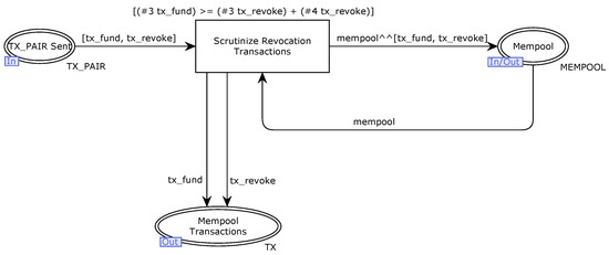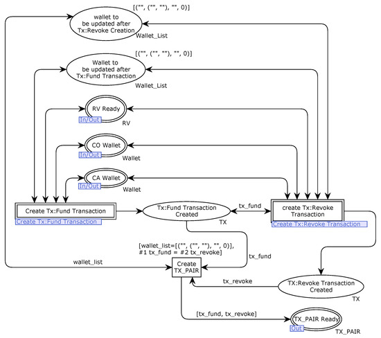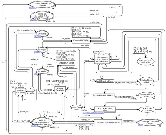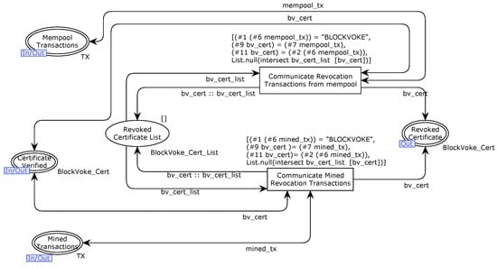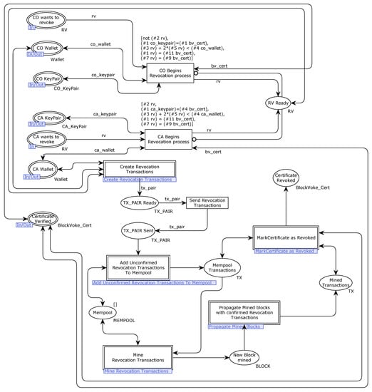 Figure 10 illustrates the ‘Revoke Certificate’ sub-module of the CPN model and models the revocation process of BlockVoke. The Revocation process is initiated by either a CO or a CA. Following this, first, the revocation transactions are created in the ‘Create Revocation Transactions’ sub-module. The CPN model makes sure that any other revocation process cannot be initiated until the transaction pair is ready.