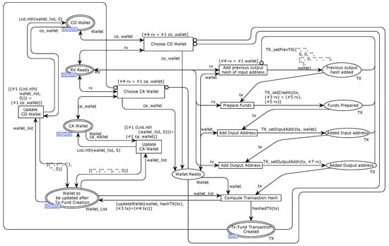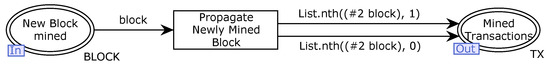 Colored Petri Nets in particular became popular for formalizing blockchain-based protocols, e.g., [16,17,18]. Both can be understood as state machines, and a mapping exists from blockchain data structures (tokens) to colored CPN tokens. Moreover, CPN-ML expressions are used to specify and implement data types and operations of the modeled system, which correspond to the functionalities of blockchain smart contracts. The authors of [19,20] formalized the Authcoin protocol [21] using CPNs and subsequently performed a risk and threat analysis using the ISSRM domain model [22] before mitigating identified risks using security risk-oriented patterns (SRPs) [23,24]. In addition, CPNs have also been used in the past for the specification of electronic business enactments and cross-enterprise collaborations [25].