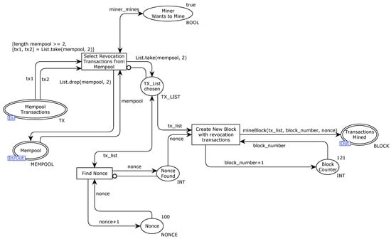 Formalizing the BlockVoke protocol requires an appropriate modeling strategy, mapping the existing descriptions of the protocol, as outlined in Section 3, to the corresponding elements of a CPN model [8,9]. The resulting sound model allows the consideration of concurrency conflicts, the prevention of dependability issues and the detection and mitigation of design flaws.