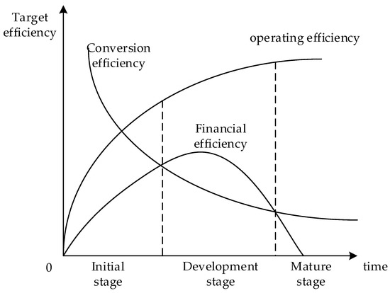 In the initial stage, the operating efficiency increased rapidly, and the conversion efficiency was higher than the financial efficiency. At this time, the government adopted active incentive policies. The component manufacturers mainly provided traditional cast-in-place materials and began to try to provide prefabricated components. The production cost of prefabricated components was high. In the development stage, operational efficiency is further improved, technology development costs are reduced, and financial efficiency is higher than the conversion efficiency. At this time, the government adopts a prudent incentive policy, component vendors mainly provide components, and prefabricated buildings are well developed. In the mature stage, the operating efficiency gradually rises but the trend is flat, the technology is more mature, the cost is reduced, and the financial efficiency declines gradually to zero. At this time, the government withdrew and the market played the role of resource allocation.
