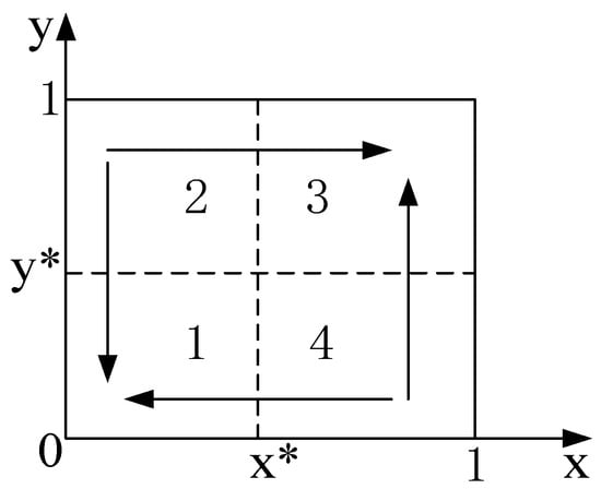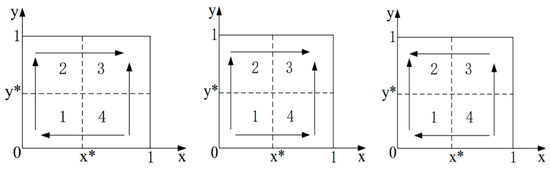 In the development stage, the incremental cost of the component business is still greater than the incremental income brought by the production and sale of components, but the difference between the two is relatively close, namely . From the government’s point of view, in the initial stage, strong incentive policies have prompted component vendors to provide components, and prefabricated buildings have been fully developed. At this time, the government’s fiscal and taxation policies need to be slowed down to allow the market to play a certain role. Only use funds to control the industry, namely . According to the above analysis, two situations can be drawn, namely and . The two situations show the different degrees of the government’s fiscal and taxation policy incentives, with the former more prominent in the role of market allocation. Based on the above assumptions, it can be concluded that the replication dynamic phase diagram of the government and component vendors in the development stage is that shown in Figure 5.