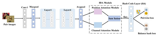 The overall architecture of the deep hash with the improved dual attention module, which is comprised of three key components: (1) pairs of images are fed into the ResNet18 network to obtain deep feature representations; (2) deep features are fed into the IDA module to obtain fusion features; (3) a hash code layer (fch) is used for transforming the fusion feature into K-dimensional binary code.