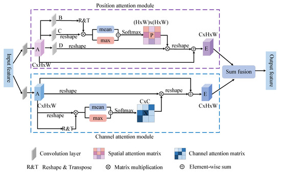 As shown in Figure 2, according to feature map , is reshaped to and express the transpose of as . Then, this study directly performs a matrix multiplication between and to obtain matrix . Meanwhile, is also processed similar to Equation (3), as shown below: