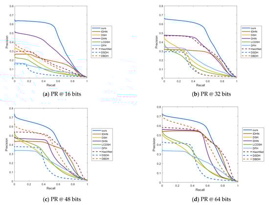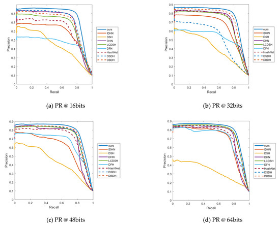 (a–d) represent the PR curves on NUS-WIDE of all algorithms when the length of the hash code is 16, 32, 48 and 64 bits, respectively.
