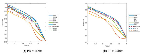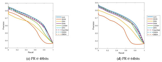 Figure 4 respectively shows the PR curves of 16, 32, 48 and 64 bits on the NUS-WIDE data set. As shown in Figure 4a,d, among all the comparison algorithms, DBDH has the best effect; the PR curve of our method is significantly higher than that of the DBDH method. Therefore, the performance of our model is better than that of the other models. In Figure 4b,c, the PR curves of all the methods are relatively concentrated, but our method still achieves the best performance.