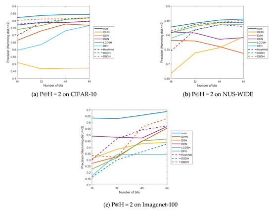 In order to achieve the goal that the Hamming ranking only needs time searches, the performance of the P@H = 2 is very significant for the retrieval of the binary space. As shown in Figure 6a–c, comparing the P@H = 2 results of all methods, our method achieves the highest precision on the three data sets, which verifies that our model can be concentrated with more relevant points than all the compared methods. Particularly, P@H = 2 of our method on 64 bits achieves optimal performance on the three data sets.