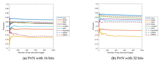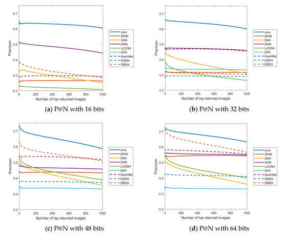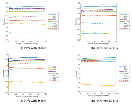 Figure 8 shows the P@N curves on the NUS-WIDE data set. As can be seen from Figure 8a–d, with the increase in the length of the hash code, the accuracy also increases. The accuracy of all methods returning the first 1000 images is relatively stable, and our method has the highest accuracy.