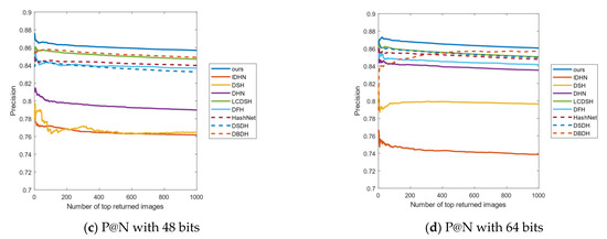 Figure 9 shows the P@N curves on the Imagenet-100 data set. As can be seen from Figure 9a,b, when the length of the hash code is 16 and 32 bits, the accuracy of this method is obviously better than the other methods. Meanwhile, in Figure 9c,d, with the increase in the number of returned images, the corresponding precision of our method decreases in a small range, but the accuracy of our method is still the highest.