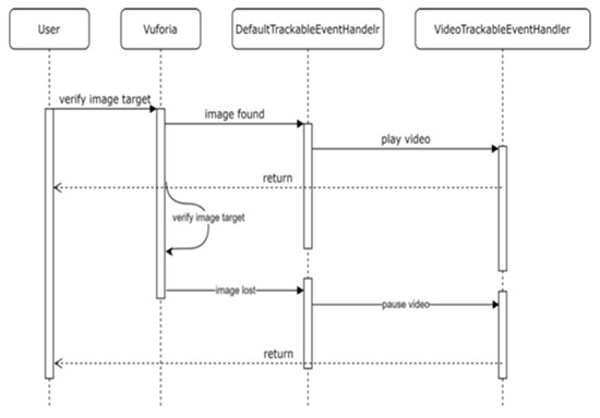 Figure 3 depicts the UML sequence diagram for Zone 1′s video overlays. The user approaches a poster and verifies whether Vuforia recognizes an image target. If an image is found, the DefaultTrackableEventHandler fires and the video is displayed and played. Whenever the tracking is lost, the video disappears and pauses. Vuforia uses extended tracking, utilizing the HoloLens’s spatial mapping to stabilize tracking.