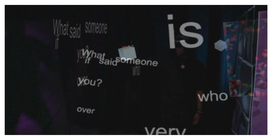 Figure 4 depicts a video playing over a (black and white) poster. Figure 5 shows the totem. Figure 6 depicts mixed reality capture of the word dropper from a third person perspective. Figure 7 shows the connecting lines the user sees when looking back from the exit onto Zone 3, visualizing the order in which the user has ‘released’ the poem’s audios from the interactive tilt brush artworks.