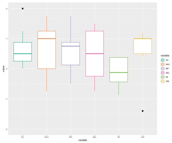Results for the SPINE (negatively formulated items 8/11/12/13/18 reversed; SC = system control; NAV = navigation; MP = manipulation; SEL = selection; IM = input modalities; OM = output modalities; n = 7).
