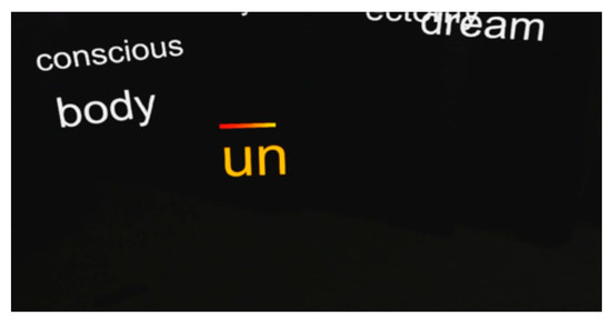 The new word composer offers the user 27 possible combinations of prefix (trans-, pre-, and un-), stem (body, conscious, and dream), and suffix (-ing, -ectomy, and -ly). For all possible 27 combinations, one definition was written by the poet and added to the system to be displayed upon completion of a compound by the user. Relevant word groups are highlighted in red and show a gaze-activation progress bar to indicate that selection is happening. At the end, the instruction box asks the user to make their way out and return the headset.
