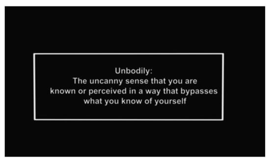 The design concept for UNBODY applies escape room dimensions (see Table 2) to a poetic creation. Specifically, UNBODY investigates the ambiguity of our digital worlds and our physical bodies through AR texts. Bernard’s work explores being black, queer, and trans in Britain [26,27,28]. In UNBODY, they use texts to break down users’ conceptions of the boundaries that separate categories of waking and dreaming, physicality and digitality, and body and identity. In UNBODY, Bernard writes “we acknowledge possibility, not probability. This is the same world, but you are sleeping. Your living body relates to the world in a way that is unknowable to the conscious mind. Holding your sleeping self in your hand, this is how you move through a dream.” In other words, UNBODY reconstructs a fictional dream state that can change as the user moves through the installation space, which is subdivided into three zones.