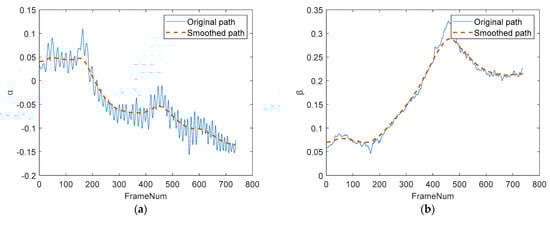 where is the smoothed trajectory, is the original trajectory, and is the weight controlling the smoothness of the stabilized trajectory. For each video sequence, the camera’s rotation in the 3D space can be mapped to a curve on a Riemannian manifold. The stable camera’s 3D rotation can be obtained by optimizing the geodesic distance of the curve in this space. As shown in Figure 2, the rotation matrix is transformed into a Euler angle to describe the original path and smooth the path using Equation (5):