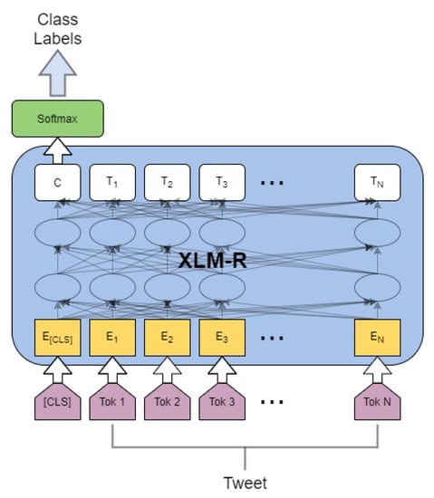 - Conneau, A.; Khandelwal, K.; Goyal, N.; Chaudhary, V.; Wenzek, G.; Guzmán, F.; Grave, E.; Ott, M.; Zettlemoyer, L.; Stoyanov, V. Unsupervised Cross-lingual Representation Learning at Scale. In Proceedings of the 58th Annual Meeting of the Association for Computational Linguistics, Online, 5–10 July 2020; pp. 8440–8451. [Google Scholar] [CrossRef]