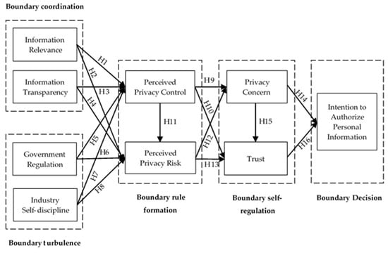 The current study is specifically guided by the classic research of Xu et al. [17] and Widjaja et al. [18], in which boundary coordination and boundary turbulence are represented by fair information practices (FIP) and institutional privacy assurance (IPA). Meanwhile, to avert personal information that has been infringed upon effectually, Xu et al. [19] elaborated that users’ control and risk perceptions determine the bilateral privacy boundary. Once the risk-control assessment is completed, the individual’s privacy boundary rules are temporarily formed. However, privacy boundaries are subject to constant variation and would be reshaped in subsequent interaction practices. Chang et al. [16] integrated the two privacy attitude factors of privacy concern and trust belief into their theoretical model to better explain the process of boundary self-regulation. When privacy boundaries achieve the best balance point through self-regulation, information subjects would make decisions in light of the privacy boundaries of both parties, i.e., clarifying the scope, time interval, and manner of information authorization.