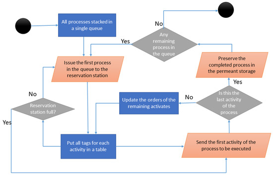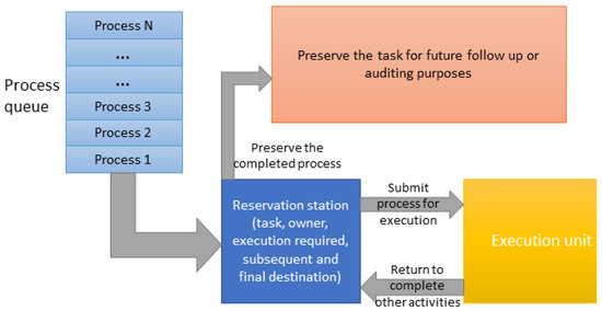 The reservation station in the Tomasulo algorithm acts to control the flow of the program and ensure the integrity of the data (i.e., no data hazards). The Tomasulo algorithm checks first if there is a space to accommodate the instruction. Then, it fills all information for this instruction in the table. Information includes the operation and the destination of the outcome. In our approach, we had data for each activity of every process. The reservation station should first check if there is a space to accommodate this task, the owner, and where it should go next.