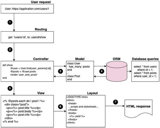 A web application framework is a tool created to facilitate the process of web application development, define the basic structure and functionality of the web applications and make such flaws less likely to occur as the effect. In this contribution, we mainly focus on one web framework in particular—Ruby on Rails (RoR) []. This approach is based on the dynamic multi-paradigm Ruby programming language. While being one of the first frameworks of its kind and having an immense influence on key aspects of web application development, RoR remains prominent to this day. However, RoR has ceded ground to its competitors in recent years and is no longer the most popular backend framework [], with one of the speculative reasons for this development being relatively slower performance of Rails-based applications compared to other frameworks, such as Django, Laravel, Flask or Express [].