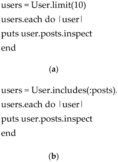 The execution of the code presented in Figure 2a will result in 11 database queries: One to retrieve the first 10 users, and another one for each user to retrieve their posts based on their id. Because the practice of iterating over all objects that belong to different ‘owner’-objects is quite common in web development, the function includes(), which allows it to specify the relationships to be included in the result set and is implemented in the core Rails framework.