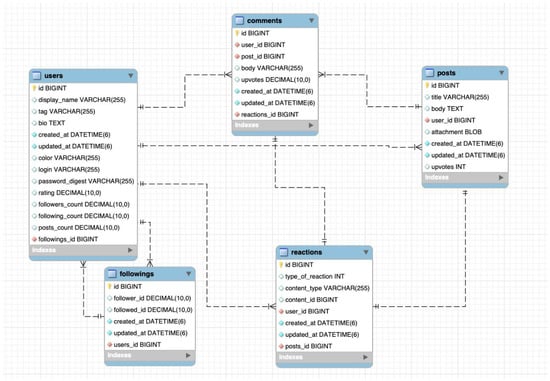 The schema of the database used in the application server is presented in Figure 3. Among notable things, the password digest needed for user authentication is stored in the Users table, the exclusive OR relation between the Reaction and Post or Comment entities is resolved by adding content_type and content_id columns to the Reactions table, which corresponds to a polymorphic association on the ORM level in the application. The self-referential relations between Users, Users-Followers and User-Followees are modeled by adding an additional table that stores pairs of follower and followee ids.