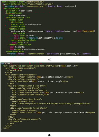 Most Model components, responsible for business logic and data representation, remain largely unchanged between the studied monolith and SPA applications. In addition, the logic and principles underlying the Templating mechanism, Routing, State management and other components present in both types of architecture are also overlapping to a large extent, as demonstrated by the example of the custom templating mechanism in JavaScript (Figure 4a) compared to an HTML templating language Slim [], popular in monolith Rails applications (Figure 4b).