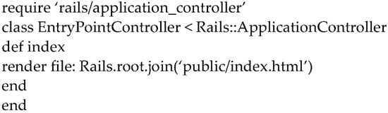 Rails provides a set of middleware for general purpose applications by default. It is possible to disable redundant parts of this middleware when using the “api-only” configuration. Among the disabled middleware are different modules responsible for assembling and delivering the appropriate HTML or other format responses to user requests, storing the session state in cookies and others. When this configuration is selected, however, the serving of regular HTML responses becomes not supported, and the application cannot function properly. In order to overcome this issue, a “regular” Entry-Point controller was created by overriding the default behavior of API-only controllers, with the sole task of serving as the default index page with the relevant scripts and stylesheets (see Figure 6).